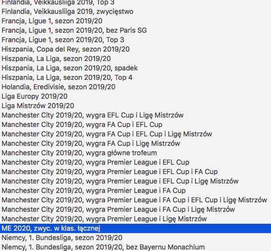 Dodatkowo w każdym sezonie można obstawić tzw. Zakłady bukmacherskie Totolotek długoterminowe. W ich zakres wchodzą takie zdarzenia jak: Kto wygra Polską Ekstraklasę, Kto będzie MŚ kierowców Formuły 1. Po odświeżeniu strony ilość możliwości do obstawienia wzrosła kolosalnie, o czym można się już przekonać na stronie bukmachera. Poniżej próbka tego co tam możecie znaleźć.